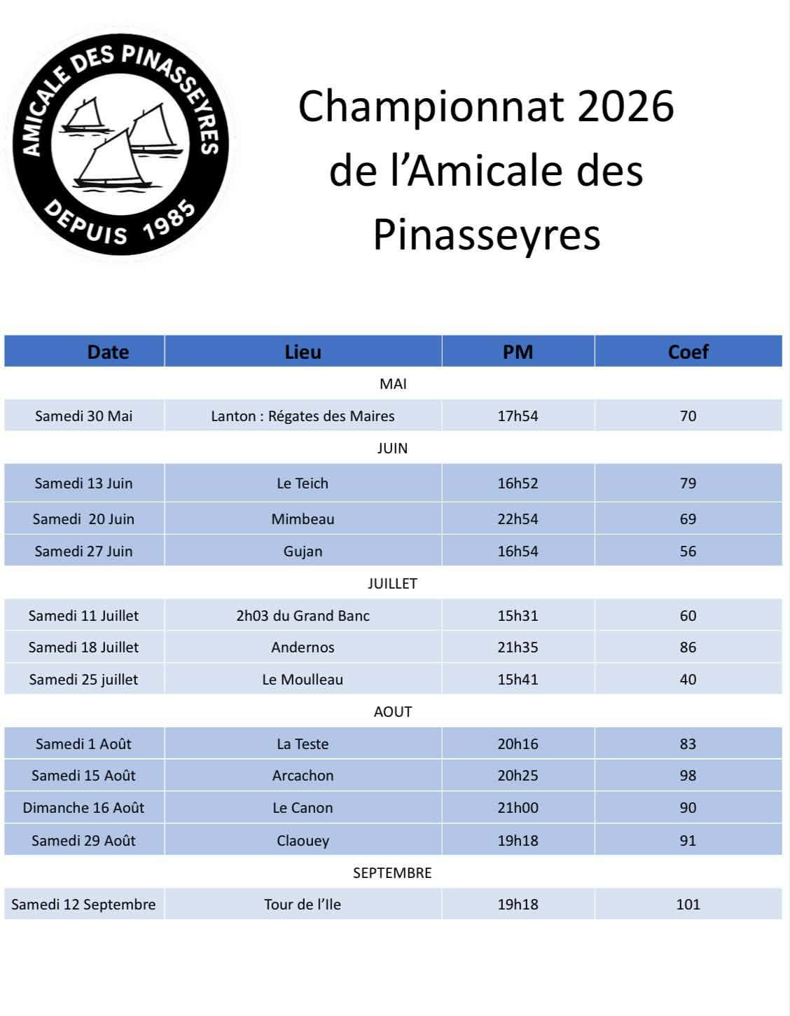 Le calendrier des régates 2026 ci-dessous :